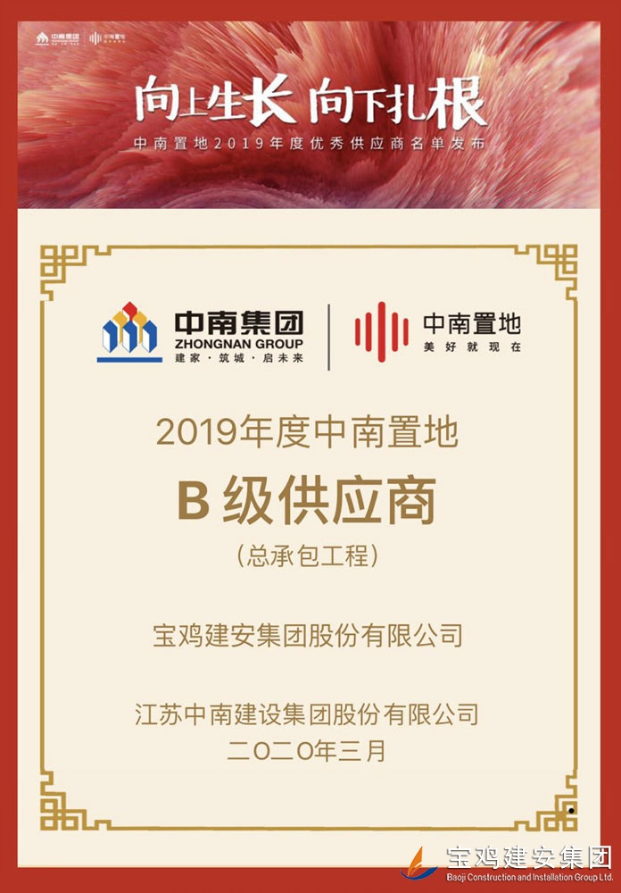 “中南置地2019年度優(yōu)秀供應(yīng)商”由中南置地設(shè)立,從全國100座城市360個(gè)標(biāo)桿項(xiàng)目中選出,A級(jí)供應(yīng)商8家,B級(jí)供應(yīng)商36家。寶雞建安集團(tuán)股份有限公司在360個(gè)標(biāo)桿項(xiàng)目中脫穎而出,成為陜西省唯一一家B級(jí)供應(yīng)商。